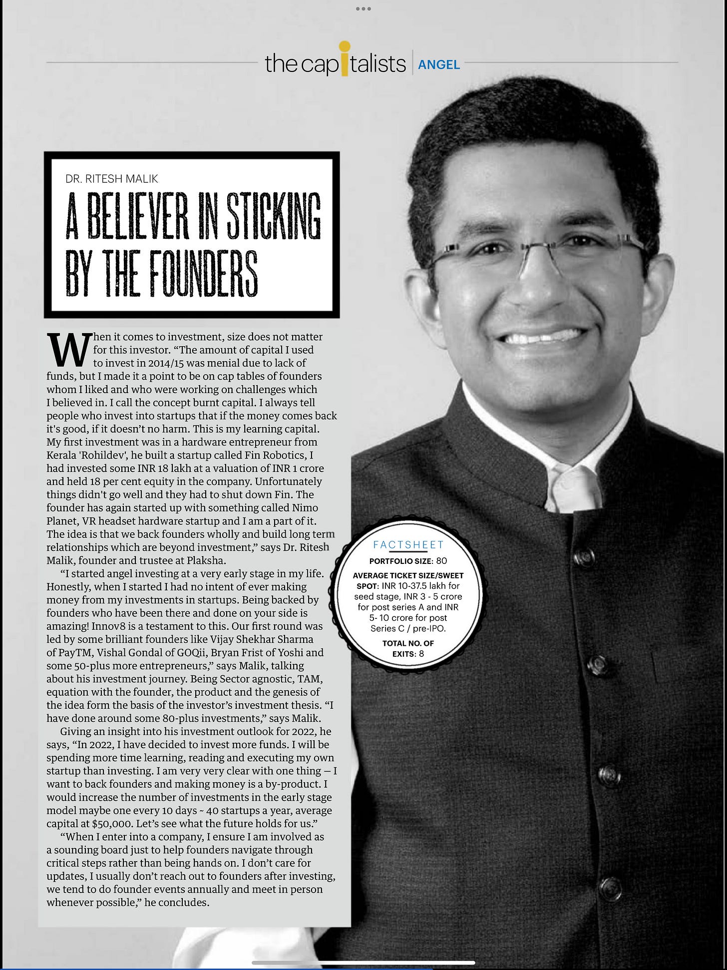 As an investor my KRA is not building personal wealth by investing into founders, but increasing the personal wealth of the startup founders I back. A testament to that is that founders in which I invest start investing alongside in a few quarters with me. I’m always on the side of increasing founder salary’s so that they can save & invest & give back to the startup ecosystem. Also, I try & ensure founders dont dilute unecessarily & if they do, try & help them claw back, do secondary’s etc.